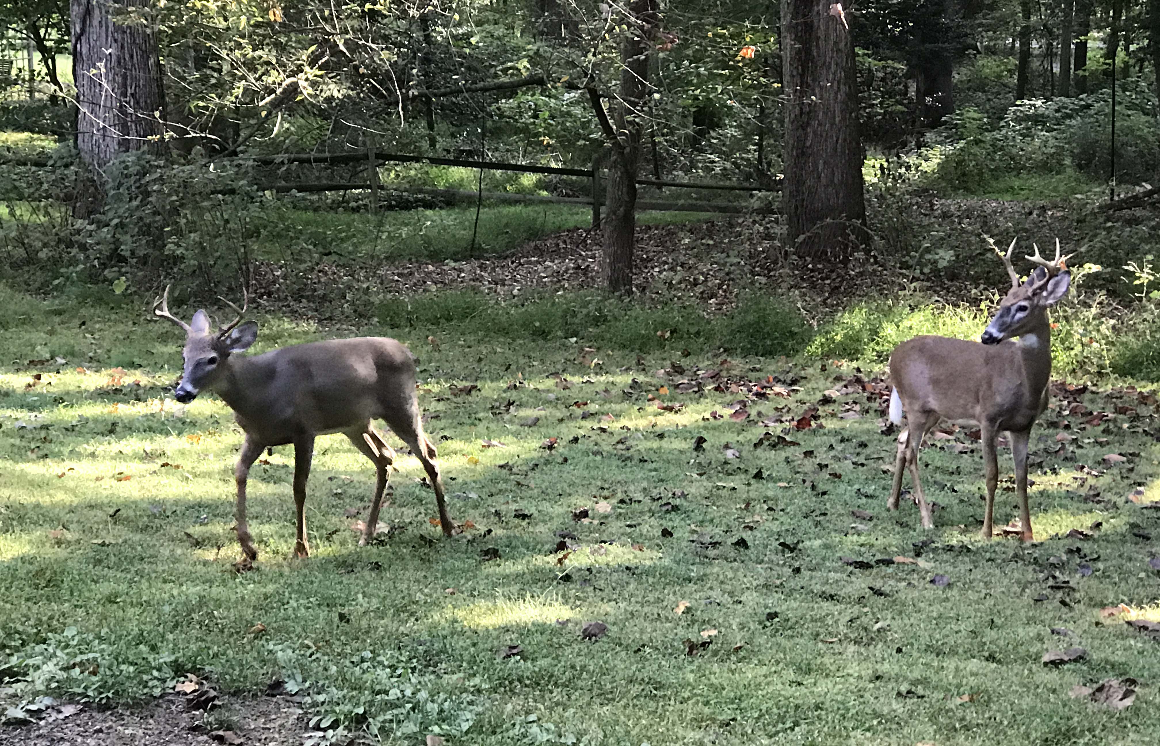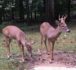 This particular morning Rudy was watching me from the porch as his friendly deer friends (brother and sister) came bounding from the wooded area at the back and side of our yard. I have known them since they were spotted wee little fawns. As babies I called them Prince Charming and The Princess. Now Charming is quite the “king” and man about town and his sister, still the Princess, remains near by him most of the time. That week Charming had shed his antler velvet and for the first time his antlers were in all their glory.